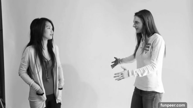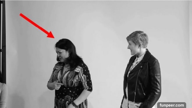 ▼實驗開始,兩位女性站著,年輕那位不知如何應對,把眼神移開