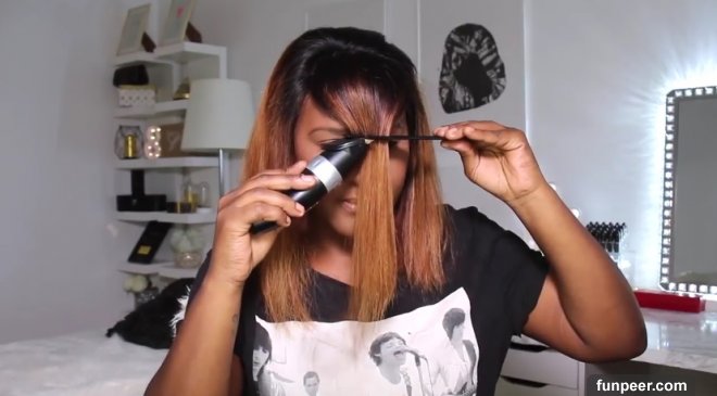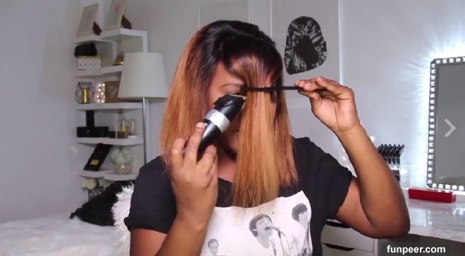 畫面裡這位咖啡色頭髮的女生,瀏海已經長到可以遮住她的臉了!再不剪的話,她可能沒辦法出去見人...她先拿出一把梳子,把前面的頭髮束起來,固定好之後,拿出了秘密武器「電動剪髮器」!