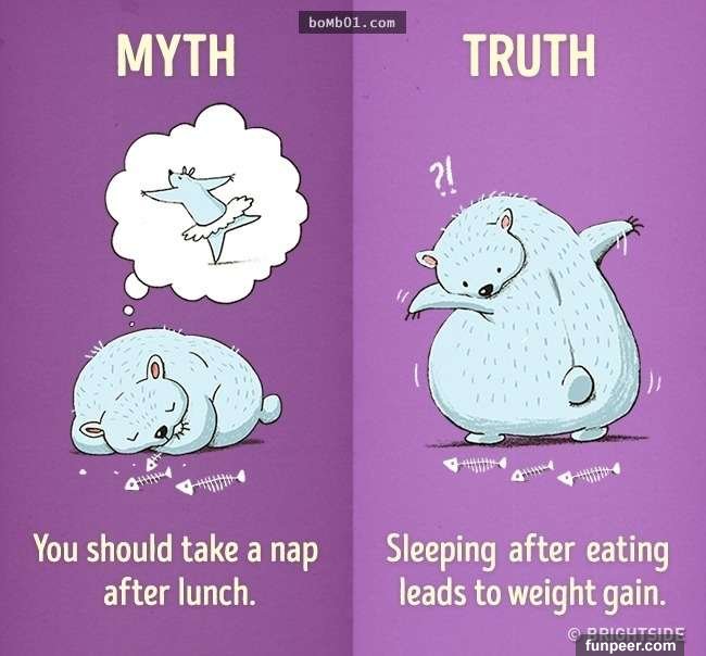 ▼6. 迷思:午飯後應該睡一覺。真相:吃飯後馬上睡覺會長胖。