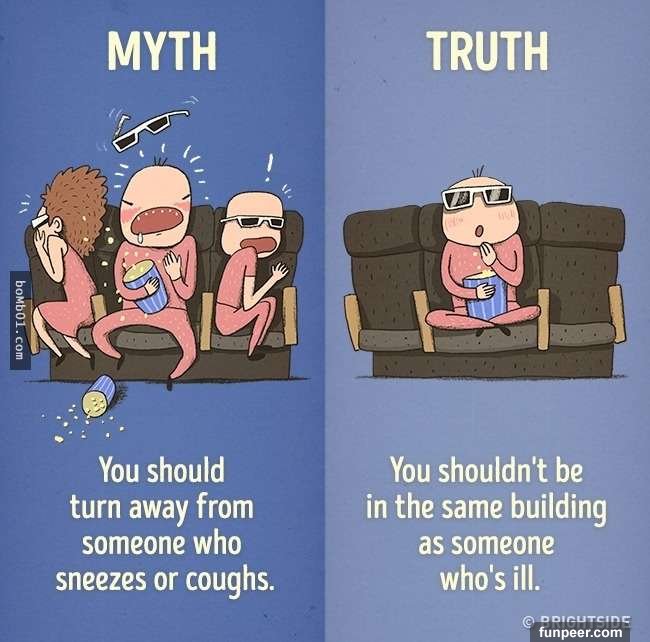 ▼4. 迷思:感冒的人咳嗽時你應該轉過身。真相:不應該和生病的人待在同一個房間裡。