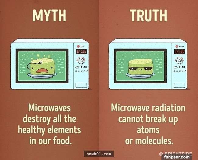 ▼8. 迷思:微波爐會破壞食物中的健康成分。真相:微波爐的輻射不會破壞原子或者分子。