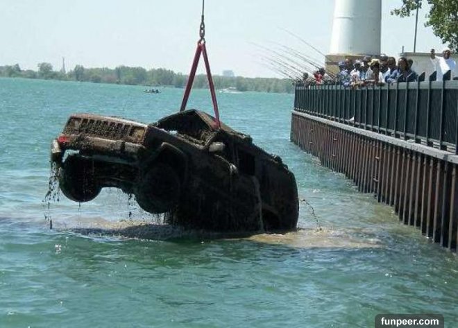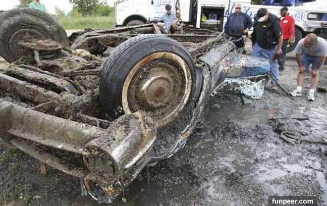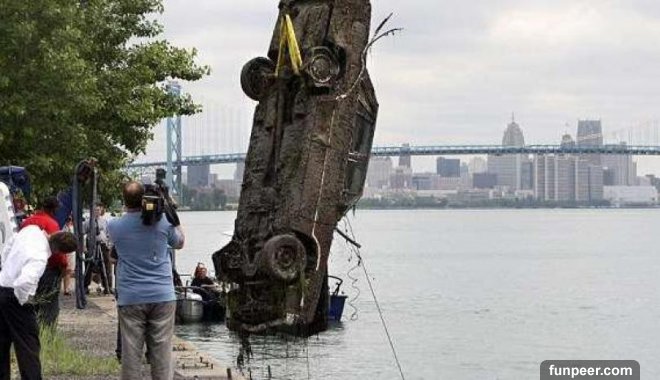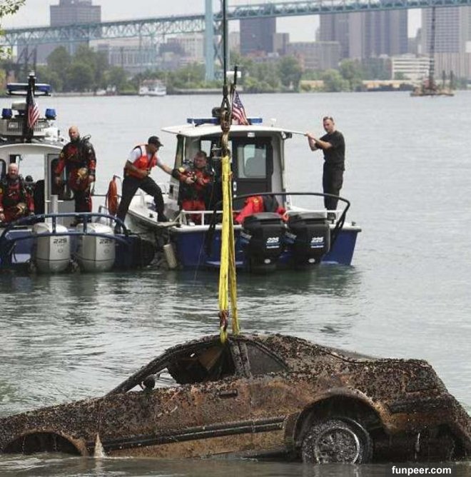 11. 底特律身為汽車生產都市,河水中當然可以撈出很多汽車!2009年撈出1輛毀損的汽車: