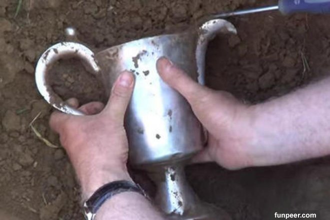 挖開泥土後他們發現了一個銀色的東西,把旁邊的泥土挖走之後發現,這個東西好像是個銀壺,可以看到,銀壺雖然身上有些劃痕,但是並沒有生鏽,也沒有任何磕碰