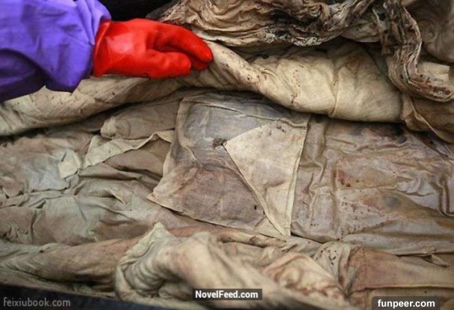 ▼棺材裡只有一些絲綢和奇怪的液體,考古學家清理一層層絲綢後,終於有所發現。