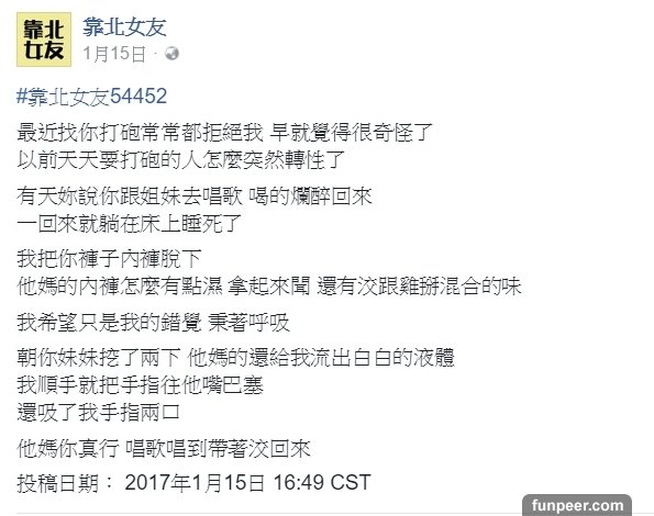 明明自己女友性需求很大,最近卻常求歡被拒,直到某天妳說你跟姐妹去唱歌,喝得爛醉回來,一回來就躺在床上睡死了。網友接著寫道