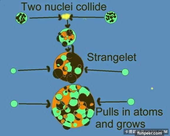 譯註:相對論重離子加速器將兩個鉛原子加速到亞光速後對撞,然後用粒子稀釋法生產出帶負電的奇異子團。奇異子團的能量極高,周圍環境對它而言就類似過冷凝的狀態。(汽水放在冷凍庫,拿出來的時候還沒結冰)因為它帶負電,可以跟周圍帶正電的原子核結合,接著就會發生連鎖的成核反應 (沒結冰的汽水被用力搖晃,瞬間整罐凍結)。奇異子團最小顆的比頭髮還小,最大頂多一公尺。小顆的可以讓地球結凍,大的可以讓地球變成一顆脈衝星(一小團散發放射線的糨糊)