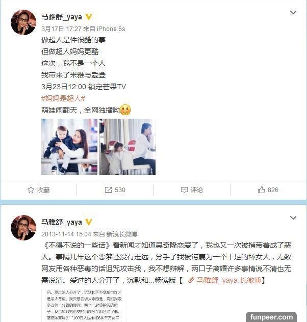 今年3月17日,4年沒發過微博的馬雅舒突然又發了一條微博,原來是因為她將帶著兩個孩子復出參加親子真人秀《媽媽是超人》的節目,特地宣傳的。