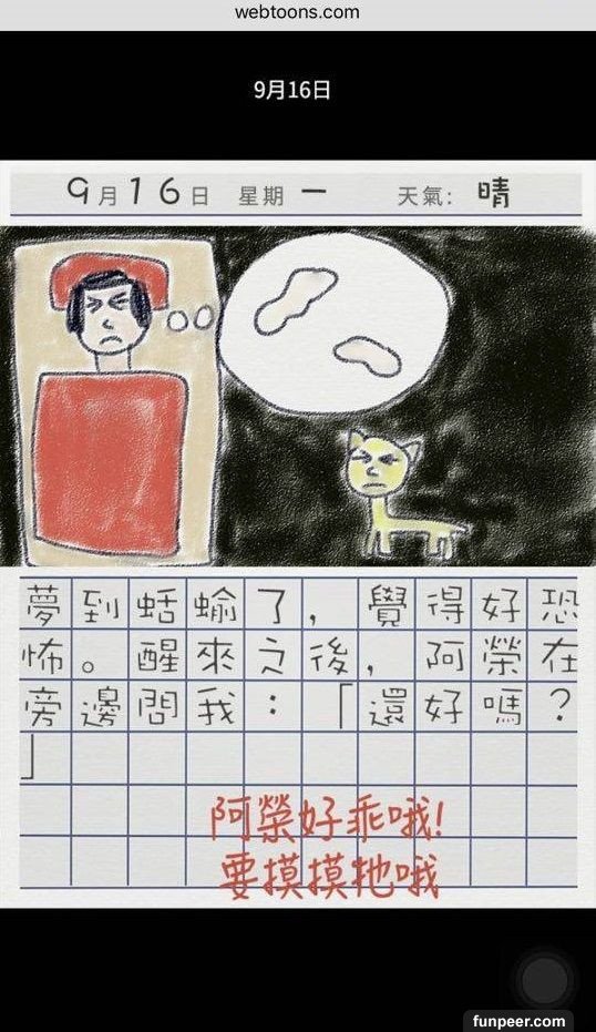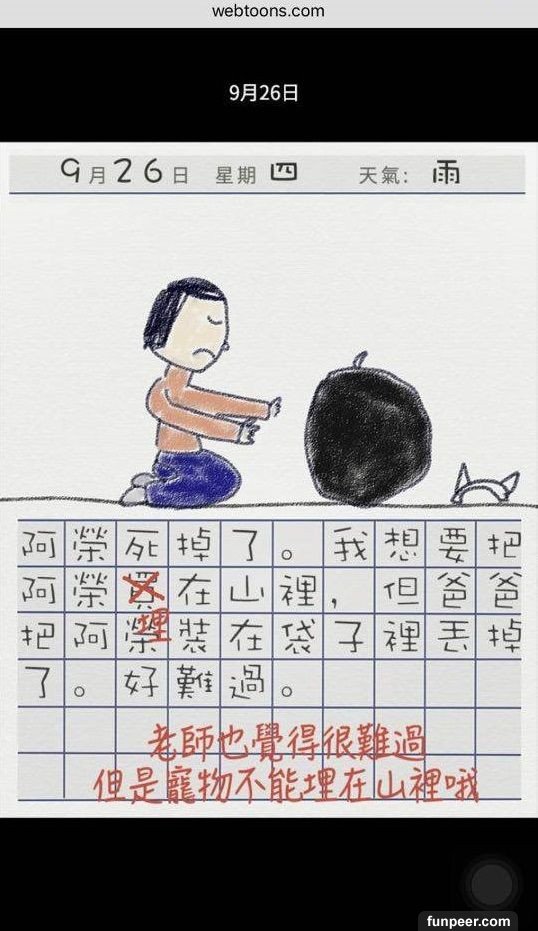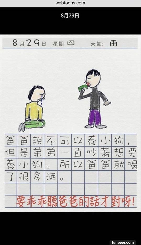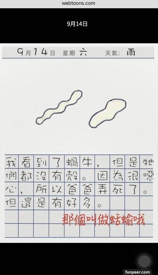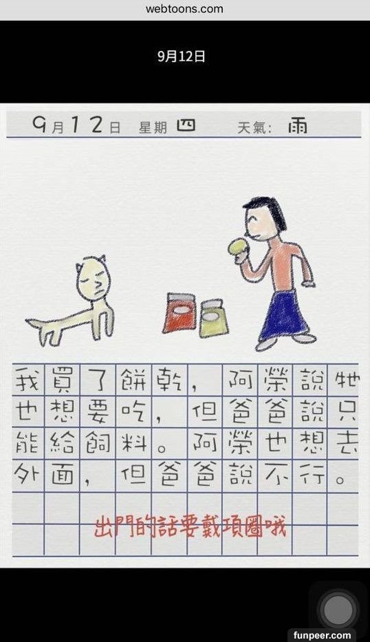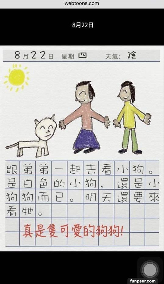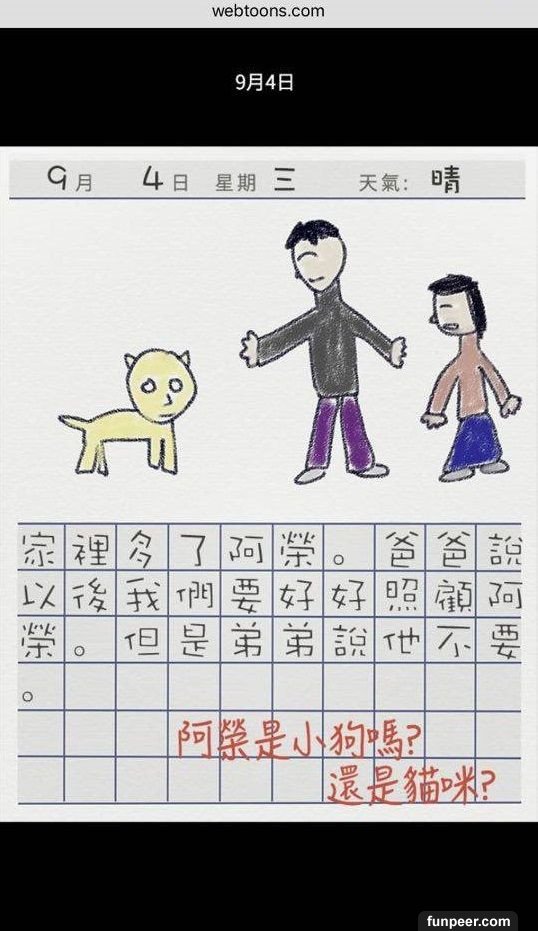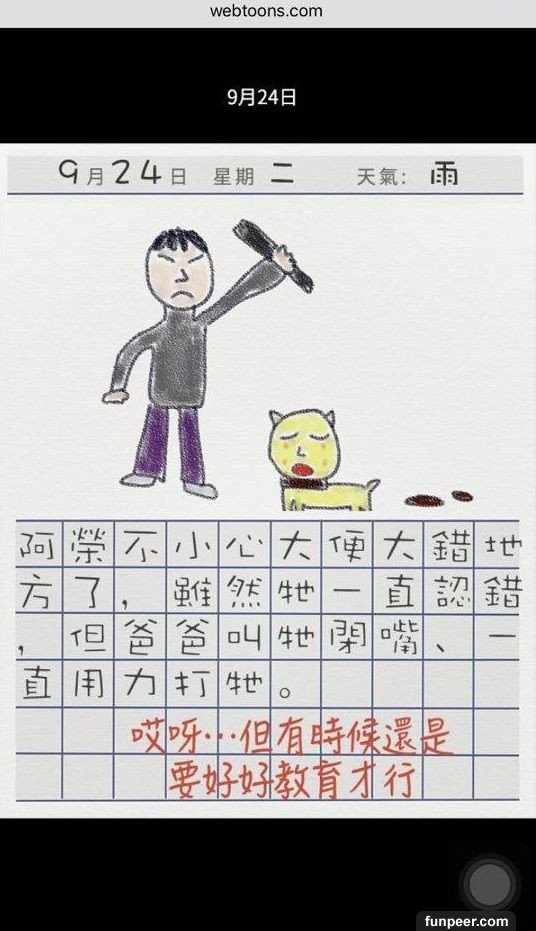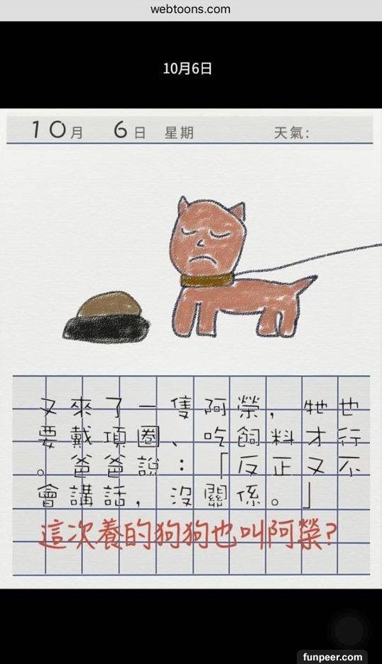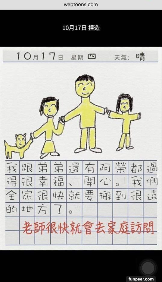 看到最後大家會奇怪,10 月17 日旁為什麼有「捏造」二字,因為故事結局並不是這樣,故事發展亦不是大家所想般美好,背後藏著恐怖訊息,就讓小編來個大膽推測。1. 在爸爸大膽說「從此就來養狗吧」,故事已經被改寫,弟弟從此再沒有出現,反而來了小狗阿榮,而弟弟衣服顏色與小狗阿榮是一樣的,並能與女孩用手語溝通,因為小狗阿榮就是弟弟,他被爸爸當作狗來照顧。而因為爸爸有飲酒習慣,最後弟弟被爸爸打死了,被棄在膠袋內。2. 而故事中的蝸牛亦是假的,相信是女孩被爸爸性侵,更不是一次,而是「很多次」。3. 不懂說話的小狗阿榮再次出現,不是有新的小狗出現,而是女孩成為了新的阿榮。因女孩被困在家內,不知外面的天氣,日記上的天氣已消失。而最後的下場亦不用多說了吧。