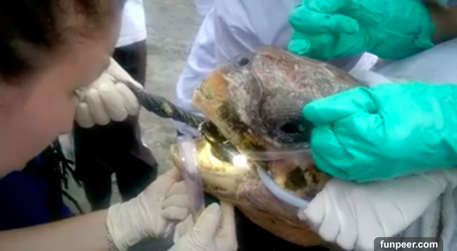 ▼雖然海龜不會說話,但是從牠的反應可以看得出來非常痛苦,甚至眼眶都泛淚了,但是為了海龜的生命安全,這些人不得不把海龜口中的異物取出來。