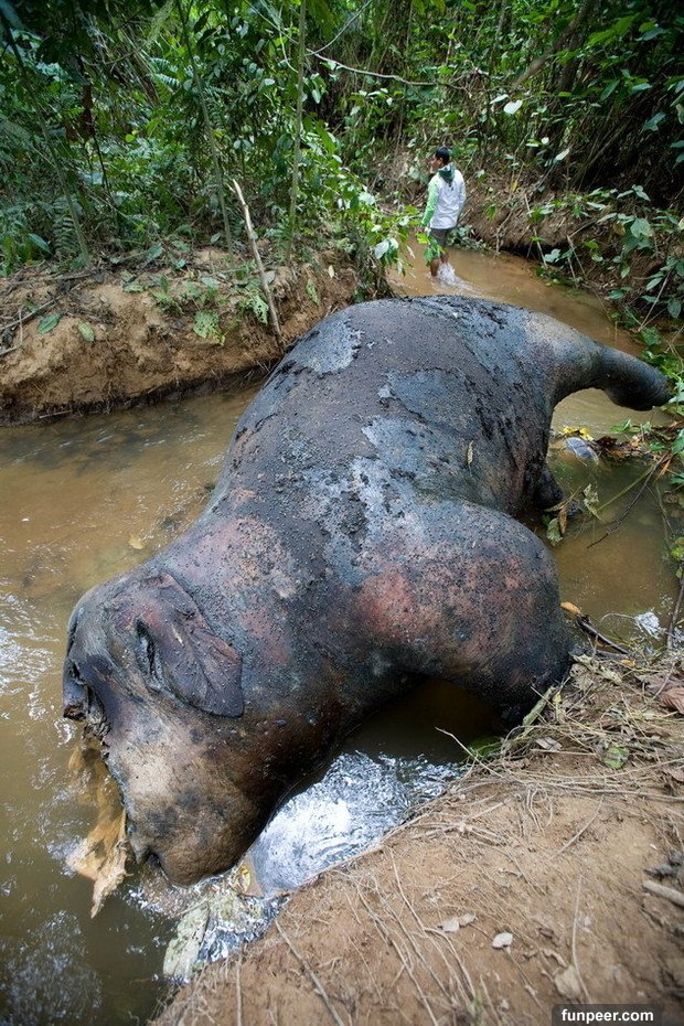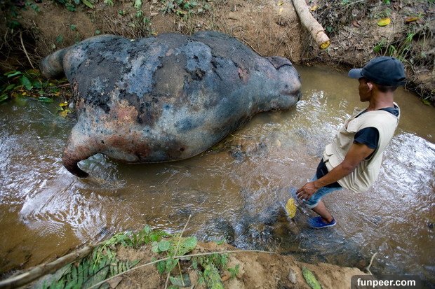 根據AsiaOne報導,這其實是一隻大象的屍體。總共有7隻蘇門答臘象死在了印尼西部,而且被懷疑是中毒死亡。已經數十隻蘇門答臘象在最近幾年被毒死,對已經即將絕種的牠們來說影響巨大。特別是在棕櫚油產業不斷破壞森林逼迫大象遷移而與人類頻繁接觸之後,死亡數字增加更快。