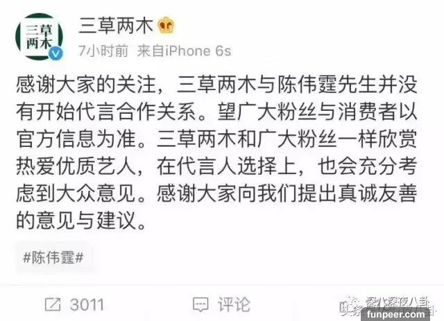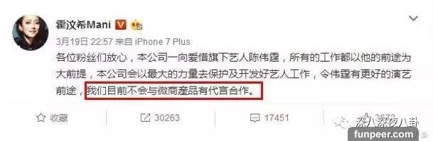 一向以簡單粗暴發聲明為公關手段的霍汶希這次卻軟了,不否認合作,也不說與對方毀約,只是來了個「目前不會合作」?!!喲呵目前不會合作,難不成是想等這陣風頭過去了再合作?!