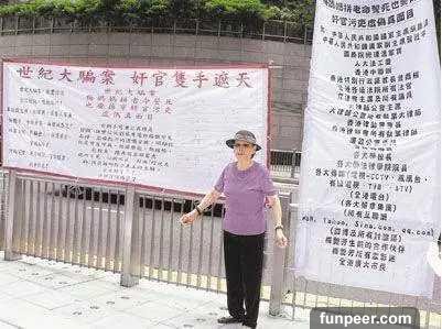 覃美金曾經因為敗訴上演鬧劇,在中環鬧市區拉上橫幅,以示抗議。
