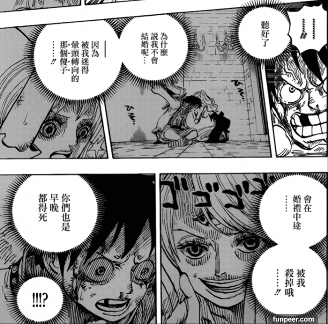 布琳在這里的表現非!常!矛!盾!其實這一點我們都能感覺到,但是基本都歸因於布琳「會演戲」。然而問題就在這里,她為什麼要演?向路飛說出了黑暗的計畫,旁邊的奶油大臣是家人,也就是說房間里的人目前都知道她的真面目,為什麼還要在離開前演一個淚流滿面?