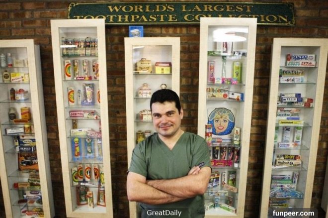 14.Val Kolpakov醫生擁有最多牙膏收藏的記錄. 他在他的牙醫診所展示了他1400條牙膏.