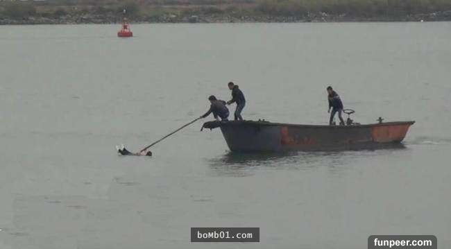 ▼漁船駛到女孩旁邊後,用竹竿將她撐起來,然後打撈上船。船上的人立刻打電話報警,消防員趕到後,用兩節消防梯才將她抬上岸。