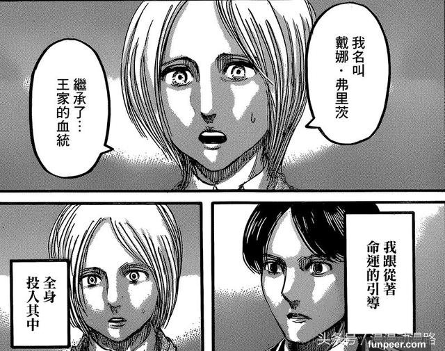 黛娜・弗里茨透露自己為「巨人戰爭」結束後弗里茨王退沒至島上時自愿留下之人的後裔;後與艾爾迪亞復權派的領袖古利夏·葉卡(艾連的父親)結婚,并生下吉克。▼黛娜・弗里茨發誓