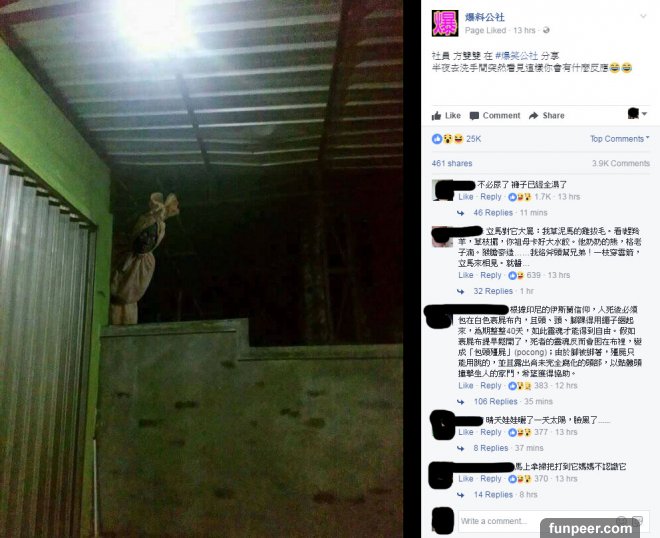 這應該算是每個人最不想遇到的惡夢吧?一名網友在「爆料公社」裡刊登這張照片問:「半夜去洗手間突然看到這樣你會有什麼反應?」。有網友幫忙解說,這是印尼民間流傳的「包頭殭屍」,根據印尼的習俗,人死後需要用白色布包住頭、身體不同部位,過了40天靈魂才能自由。但如果裏屍布提早鬆開,靈魂就會被困在白布裡,變成這樣照片中的「包頭殭屍」。而他們會用跳的去撞擊生人的門,希望可以得到協助。 ![]()
