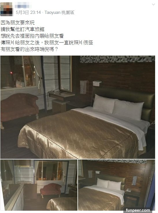 現代的人跟過去不太一樣,因為科技的發達跟資訊流通,不會再盲目的相信那些靈異現象,但還是有很多事情是無法解釋的,就像說一些「看得到」的人,也不算少數。近日有一名網友就在臉書粉絲團的「爆廢公社」上PO出照片,表示:「朋友要來玩,請我幫他訂汽車旅館,想說先去裏面拍照」。