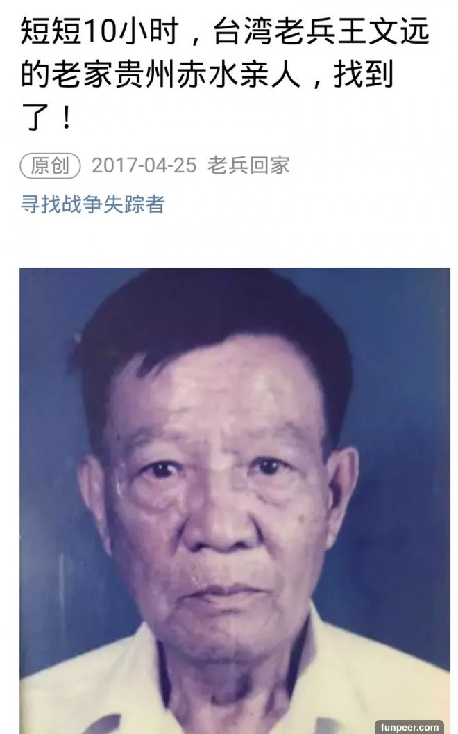 除了胡定遠之外,台灣王文遠老兵的兒子,在看到胡老先生尋親的報導後,也決定幫逝世的父親完成多年來的回家心願,由於提供的訊息更準確,僅花了10小時就火速替父親找到了失散多年的親人。