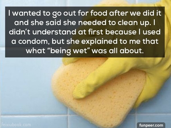 1.「我想說用嘴巴幫他戴保險套應該滿性感的,結果接下來幾天滿嘴都是潤滑油和橡膠的味道。學到一課了。」