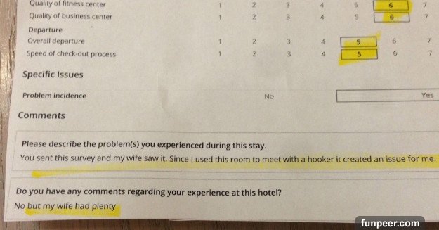 (問卷) 請描述您住房期間遇到的問題:「你們寄給我這份問卷被我老婆看到了。由於我來這都是為了跟應召女開房間,這已經對我造成困擾。」 請留下您的寶貴意見:「我是沒意見,但我老婆有很多。」 15.「這幾晚我們遇到的同志情侶比異性戀情侶多很多。」