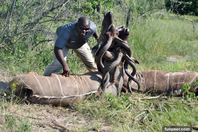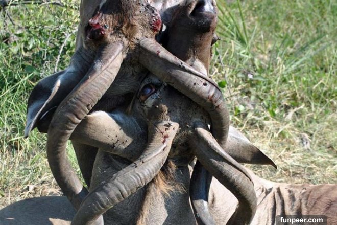 兩隻身形龐大的野獸交纏在一起,一動也不動!嚇得他趕緊上前查看....當他慢慢看清楚時,這個像是巨大麻花辮般,纏繞交織的奇怪東西,竟然是兩隻公羚羊的角!他再仔細觀察兩隻羚羊的傷口,發現他們早就死掉很久了!