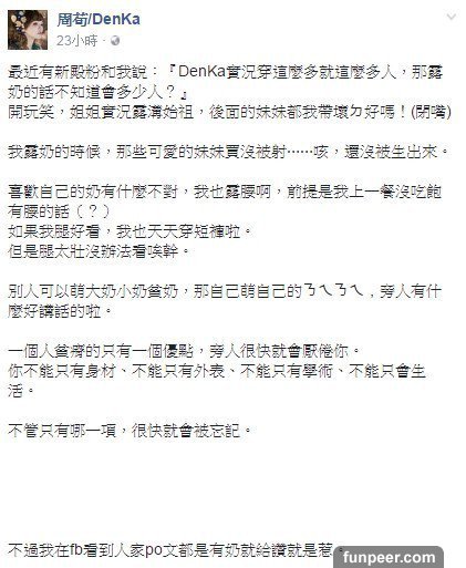 周荀文中也不忘附上自拍美照,穿著細肩帶藍色背心,自信露出胸前傲人F罩杯雪乳,辣照一曝光,果然吸引超過萬人按讚,引來大批網友留言直呼,「你看這個時間發文留言數暴衝成這個樣子嘖嘖嘖嘖」、「萬惡的細肩帶啊…好兇狠」,也有人大讚,「DenKa怎麼都好看~不一定要露」,在網路上掀起熱烈討論。
