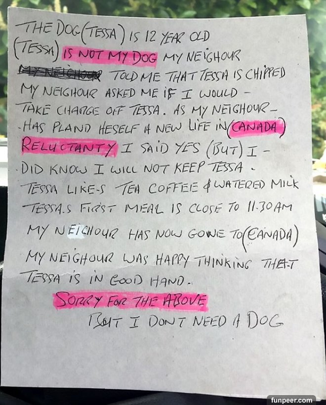 ▲這隻狗(Tessa)已經12歲了,她不是我的狗。我的鄰居說她是隻有缺陷的狗,他問我是否能照顧Tessa,因為他即將搬到加拿大度過新生活,我很勉強的答應,但我知道自己不會養她。Tessa喜歡茶咖啡跟牛奶加水,她的第一餐大概在早上11點半。我鄰居已經去加拿大了,而且他會開心地認為Tessa被好心人照顧。我很抱歉關於上面這些事,但我不需要一隻狗。 只能說這個人真的很可惡,隨便棄養狗狗還鄰居面前裝好心人,這種態度真的很不可取! 文章來源:boredpanda,編輯整理。 ✓點我,加入《LIFE愛分享》LINE好友 你可能對以下文章有興趣:「慈禧太后」為了喝人乳強押民間婦女「為她擠乳」,一旦女性無法再產出乳汁,下場竟然是要......這名女孩「被關進監獄23次」,每次都在她的臉上留下痕跡,最後一次坐牢拍照時連獄卒都「嚇到認不出來」愛因斯坦曾想阻止向日本投原子彈,杜魯門副總統只問了兩個問題,就讓他頓時啞口無言......