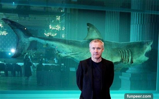 達明安·赫斯特站在自己的另一件虎鯊作品《上帝之怒》前