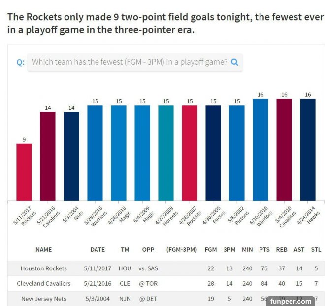 今天火箭在主場以75-114敗給馬刺,火箭全場77投22中,其中兩分球37投9中、三分球40投13中,全場僅僅命中9顆兩分球也創下聯盟季後賽單場兩分球命中數的新低紀錄。先前聯盟歷史季後賽單場兩分球數最低命中數是由騎士、籃網所保持的14次難堪紀錄,騎士在當地時間2016年5月21日對上暴龍的比賽中兩分球38投14中;籃網在當地時間2004年5月3日對上活塞的比賽中兩分球52投14中,今天的火箭將這項紀錄推進至個位數。