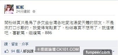 下午15時許,妮妮已經將臉書專頁的文字照片刪除,並留下最後一條告別語:
