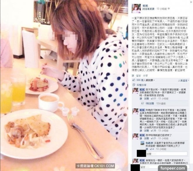 凌晨時分,臉書上有位叫「妮妮」女網友PO出一張很正常的低頭吃飯的照片,她身著波點上衣,留著齊耳短髮,側臉看上去頗為清秀。而圖片旁邊的文字,卻著實讓人嚇一大跳!