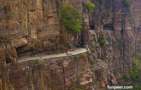 這條公路繞著峭壁蜿蜒向下,每個斧鑿痕迹都是村民們在無電力、無機械的狀況下,憑他們的雙手一錘一錘鑿出的,有的村民也在這個艱苦的環境下犧牲。