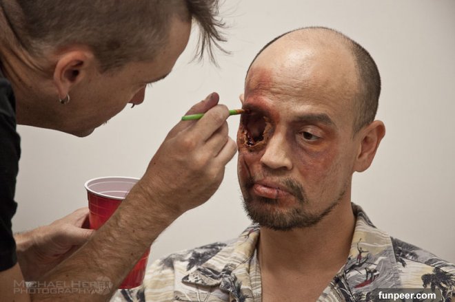 現在比利不再能當汽車技師,他正視臉上這個可怕的凹洞,如今改行當起「殭屍演員」。
