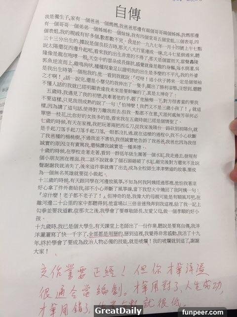 【網友回覆】「你確定這是自傳? 我差點以為是哪個痿人的事蹟」「87分 不能再高」「狂啊 別當編劇了當唬爛王比較快」「我喜歡老師的評語」「笑死這一定爆」「恭喜榮登2016年 第87屆 唬爛王 冠軍」「掰好掰滿」「我有六個姊姊 一個哥哥 全部都是我媽 自然產生」「幹話系需要你」「笑到一個美叮噹」「被唬的不要不要的哈哈哈哈哈哈」「天啊這根本是唬爛王,還是神的等級啊!」這篇自傳真是狂到不能再狂了!太好笑了XD而且老師竟然只給10分,可見多沒幽默感! 轉載:論壇