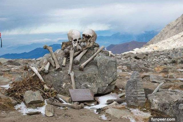 原來,每過12年,楠達德維峰的500名信徒就經過長途跋涉,來到Roopkund湖舉行祭祀儀式。沒想到卻遇到了冰雹,由於山頂很空曠,沒有可供躲避的地方,所以很多信徒都被砸中頭部致死。