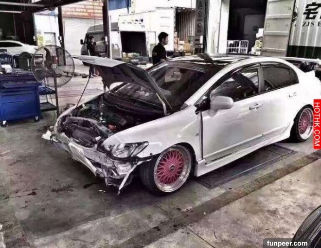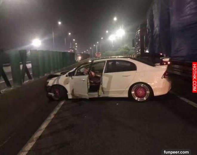 撞上護欄的白色Honda車頭幾乎撞毀,令許多網友叫好。