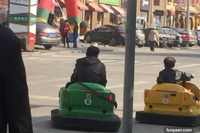 有網友拍下兩名大叔開碰碰車的模樣上傳微博,沒有人知道這兩名成年男子是誰,但這彷彿「瑪莉歐賽車」的景象也引起網友熱議。