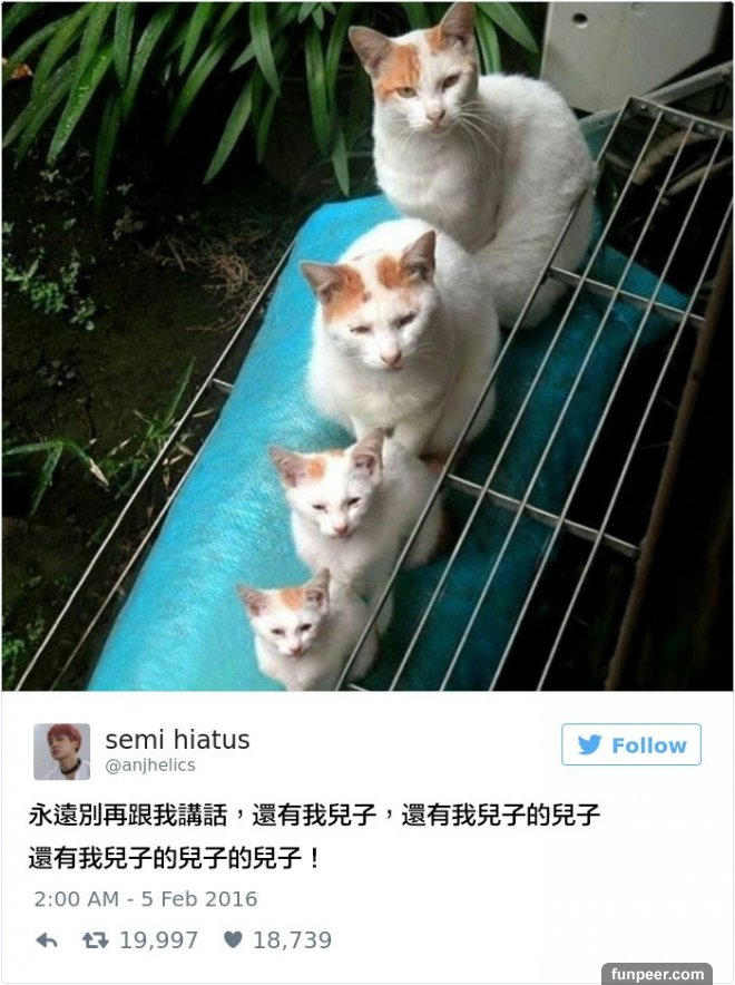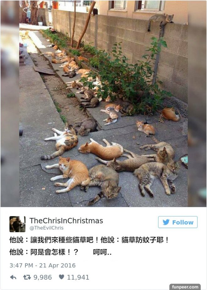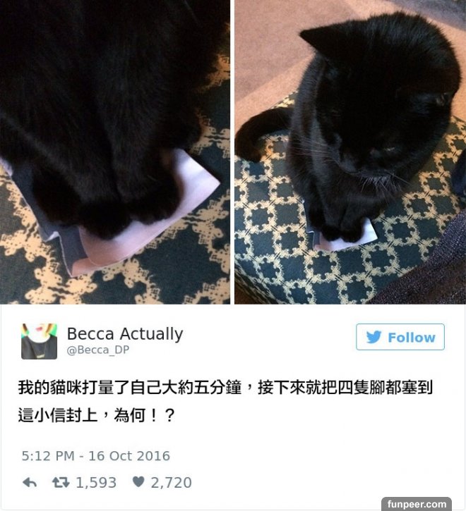 貓咪,是世界的真理。今天很難熬嗎?養一隻貓咪吧!這週很難熬貓嗎?養兩隻貓咪吧!無論如何,貓咪會替你分擔所有的煩惱。然而有些貓除了聽你大吐苦水外,他們還能製造非常多的娛樂效果,讓我們來看看2016年在tweeter上面十張最最有趣的貓照片吧!1.