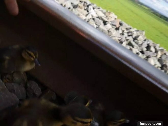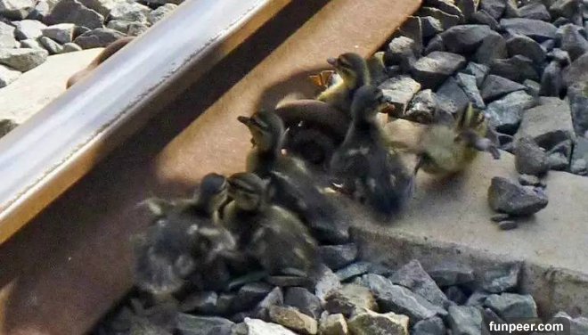 走近一看,工程師這才明白,原來是鴨媽媽帶著自己的一群鴨寶寶過鐵路,可問題是,鴨媽媽個子高,一邁腿就跨過了鐵軌,但後面跟著的6 只毛茸茸的小鴨子被自己的短腿給打敗了,怎麼也翻不過鐵軌! 聽著媽媽焦急的呼喚聲,幾隻小鴨子也驚慌失措地鬧騰起來,可不管它們如何努力,身材上的劣勢實在是太大了,它們始終被困在鐵軌中間出不去。