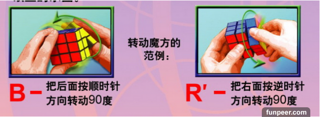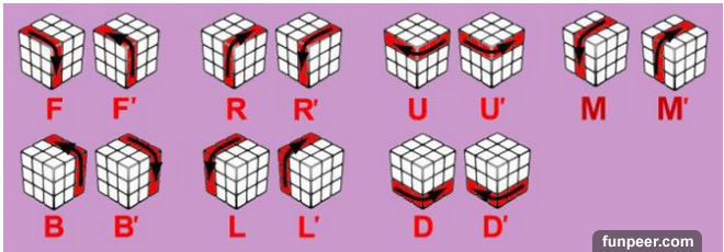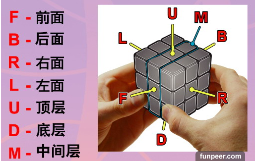 破解功略裡會用字母來說明要轉動的1層或1面,以及方向:例如:R(代表右面順時針轉90度),R`(代表右面逆時針轉90度),R2(代表右面順時針轉2次90度)下面是圖示