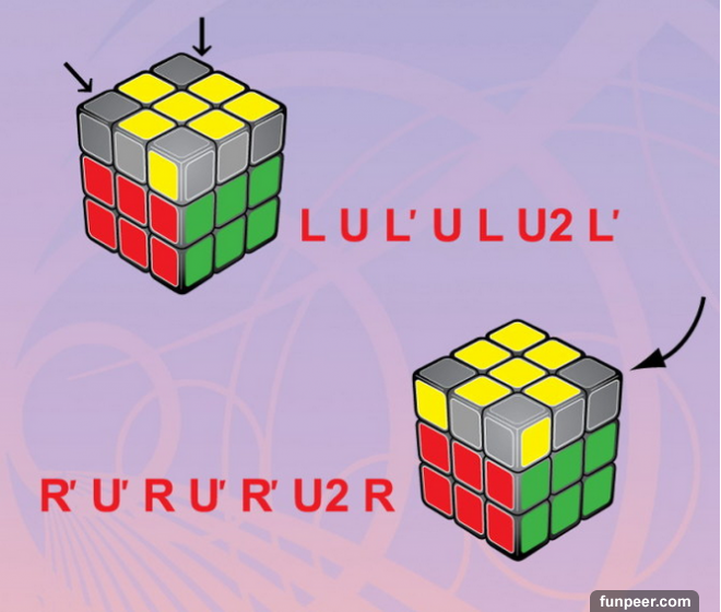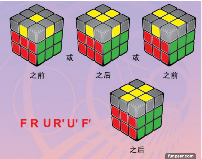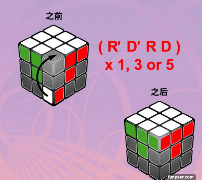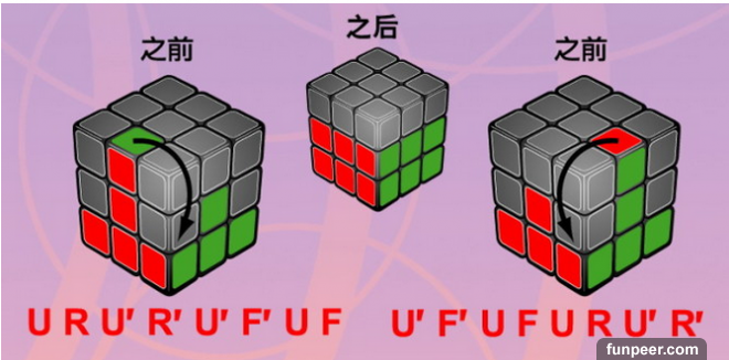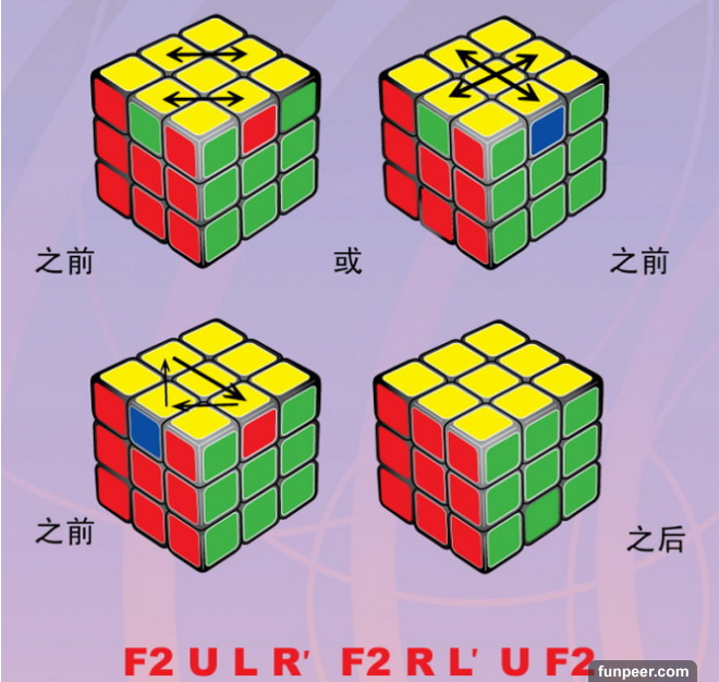 然後讓中層邊塊歸位。把白色面轉向下,找出紅綠邊塊,若紅綠邊塊在頂層則按順時針方向轉動頂層,直到邊塊與圖上的1個情況相同,在按照口訣轉動魔方,使邊塊歸位。若紅綠邊塊在中間某層,但位置錯誤或顏色錯誤,則先使紅綠邊塊在右前方的位置,再重新按照下面其中一個次序旋轉1次。