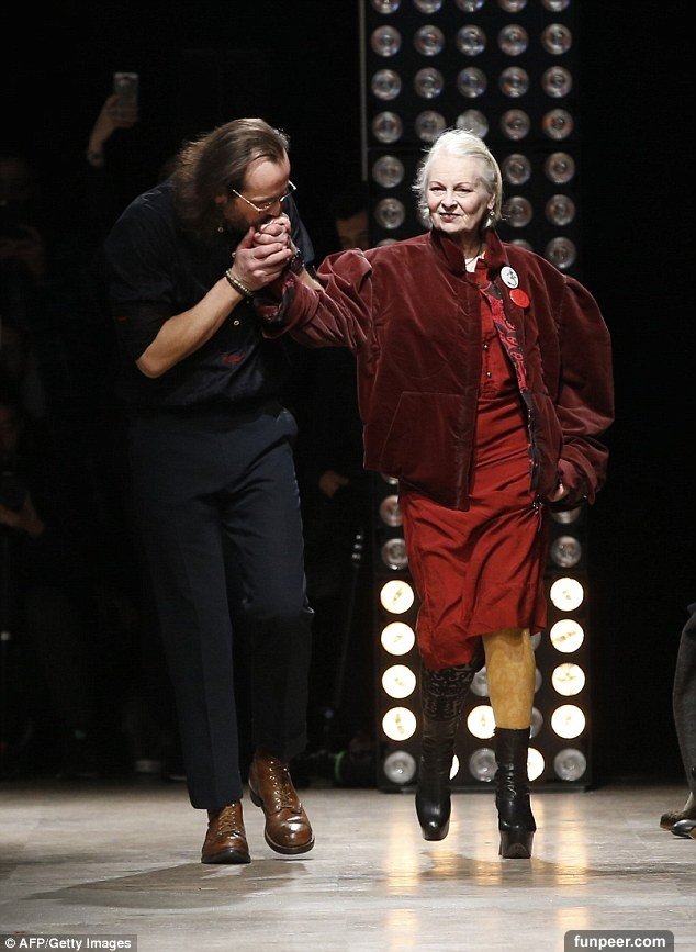 她又走上台了,不過這一次是跟另一個人一起上來。原來這名好心幫忙的老太太不是隨便路人,而是74歲的設計師Vivienne Westwood。