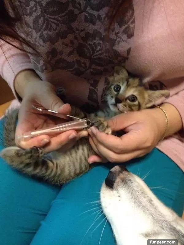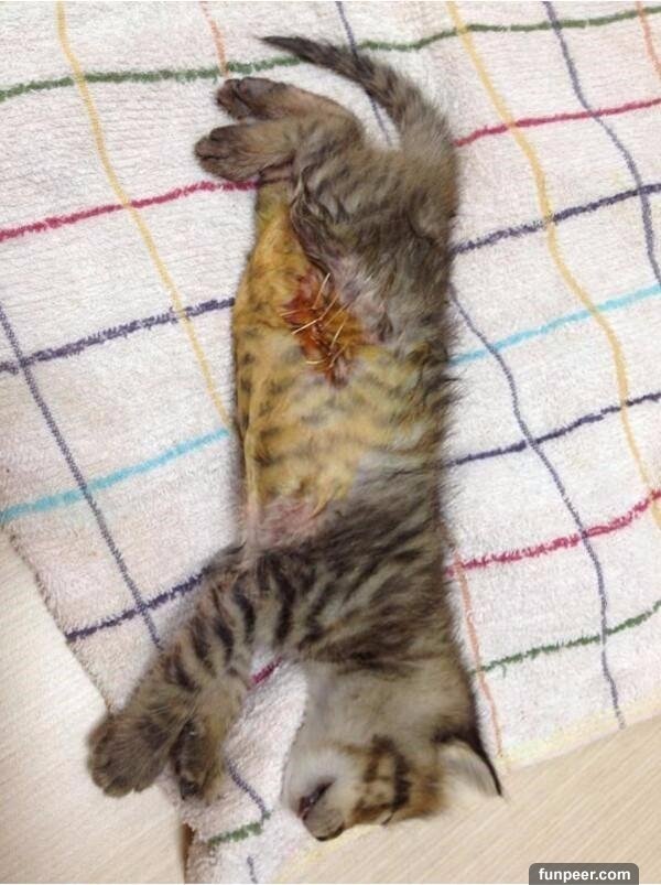 主人這才發現,原來是二哈Olfa把小貓叼回來的時候,一不小心把小貓的肚子給咬破了!這力度,Olfa真是夠二的!主人Claire趕緊將小貓送醫急救,當天緊急動了一個小手術。 因為怕照顧不好虛弱的小貓,又再付一筆錢請獸醫幫忙看護。