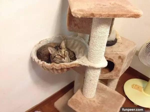 發展到有一整套的貓爬架做寢宮,平時還能上主人的大床蹭蹭睡。
