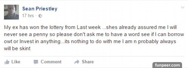 Sean在社交軟件上寫道:“我前任上周中了彩票大獎……她已經向我保證我肯定拿不到一毛錢,所以別再問我借錢或是讓我投資項目了……她中大獎跟我沒半毛錢關系,我還是個窮光蛋。”網友紛紛表示,他可能悔不當初,連後槽牙都咬碎了。