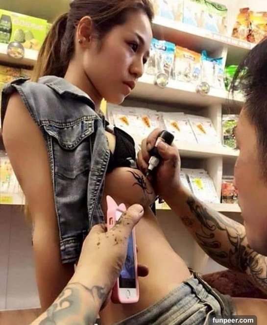 正妹側乳刺青的照片,照片中正妹露出南半球希望刺青師父刺上自己想要的圖案,左手握著正妹想要的圖案,右手在正妹的南半球上認真作畫時沒想到...