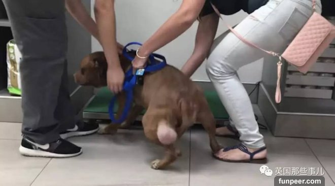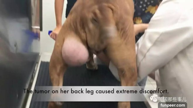 狗狗興奮地繞着大家轉圈的當兒,大家注意到了她走路吃力的原因——她的後腿上長了一顆巨大的腫瘤...