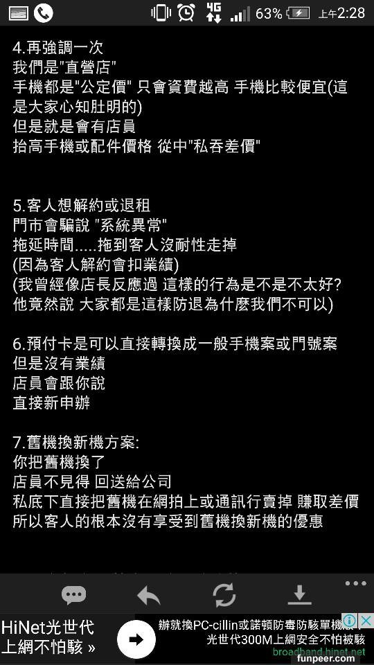 如果你們覺得不是爆料或沒這麼"爆"那你們可以刪我文章 或 罰我我是xx大的用戶進去做員工 才知道我也是受害者 覺得很幹!轉不轉八卦版 都無所謂 也單純可以發洩先說小妹我做的是"直營"門市個人認為 是合法詐騙集團不是全部 但已經是一種風氣消費者權益部分:1.店員為了作業績想盡各種辦法不讓客人續約想辦法讓客人"新申辦"(業績會比較高)會說新申辦 比較划算 折扣比較多但是有些用戶 根本就是 續約折扣比新申辦多(就是因為客人看不到電腦 所以看不到價錢所以很多人根本就是被騙)"