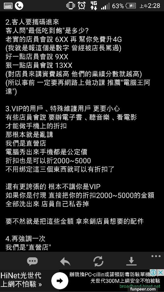 3.VIP的用戶、特殊維護用戶 更要小心有些店員會說 要辦電子書、聽音樂、看電影才能做手機上的折扣那根本就是亂講我們是直營店電腦秀出來手機都是公定價折扣也是可以折2000~5000不用綁定這三個東西就可以有折扣了還有更誇張的 根本不講你是VIP